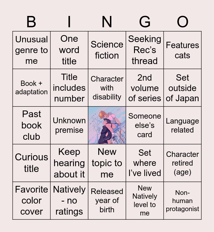 This bingo card has a free space and 24 words: Keep hearing about it, Natively - no ratings, Character with disability, Favorite color cover, Features cats, Unusual genre to me, Book + adaptation, One word title, Someone else’s card, New topic to me, 2nd volume of series, Past book club, Set where I’ve lived, Character retired (age), Title includes number, New Natively level to me, Language related, Science fiction, Set outside of Japan, Unknown premise, Non-human protagonist, Curious title, Seeking Rec’s thread and Released year of birth.