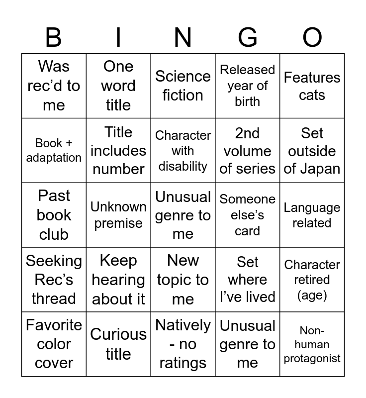 This bingo card has a free space and 25 words: Keep hearing about it, Natively - no ratings, Character with disability, Favorite color cover, Features cats, Was rec’d to me, Book + adaptation, One word title, Someone else’s card, New topic to me, 2nd volume of series, Past book club, Set where I’ve lived, Character retired (age), Title includes number, New Natively level to me, Language related, Science fiction, Set outside of Japan, Unknown premise, Non-human protagonist, Curious title, Seeking Rec’s thread, Released year of birth and Unusual genre to me.