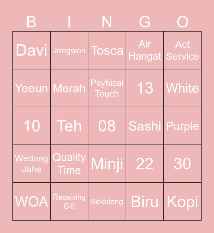 This bingo card has a free space and 24 words: Quality Time, Receiving Gift, Psyhical Touch, WOA, Act Service, Davi, Yeeun, Jongwon, Sashi, Minji, 13, 10, 22, 30, Merah, Biru, Purple, Tosca, White, Teh, Kopi, Wedang Jahe, Air Hangat and Sekoteng.