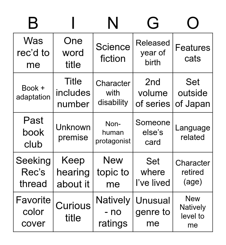 This bingo card has 25 words: Keep hearing about it, Natively - no ratings, Character with disability, Favorite color cover, Features cats, Was rec’d to me, Book + adaptation, One word title, Someone else’s card, New topic to me, 2nd volume of series, Past book club, Set where I’ve lived, Character retired (age), Title includes number, New Natively level to me, Language related, Science fiction, Set outside of Japan, Unknown premise, Non-human protagonist, Curious title, Seeking Rec’s thread, Released year of birth and Unusual genre to me.