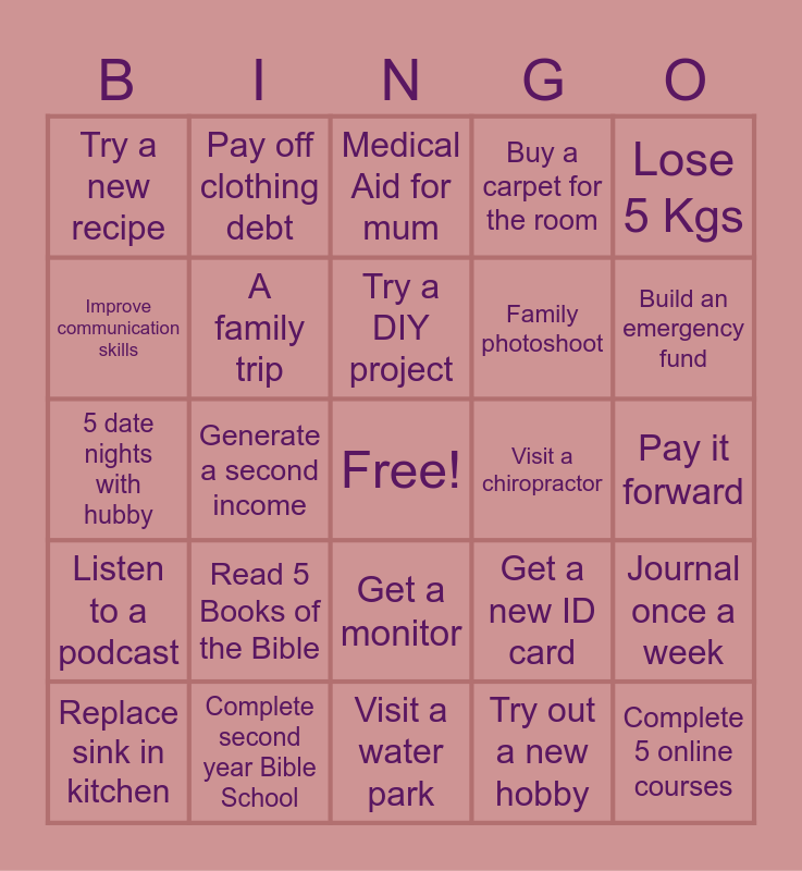 This bingo card has a free space and 24 words: Read 5 Books of the Bible, Complete second year Bible School, Try a DIY project, Replace sink in kitchen, Lose 5 Kgs, Try a new recipe, Improve communication skills, Pay off clothing debt, Visit a chiropractor, Get a monitor, Family photoshoot, 5 date nights with hubby, Get a new ID card, Journal once a week, A family trip, Try out a new hobby, Pay it forward, Medical Aid for mum, Build an emergency fund, Generate a second income, Complete 5 online courses, Listen to a podcast, Buy a carpet for the room and Visit a water park.