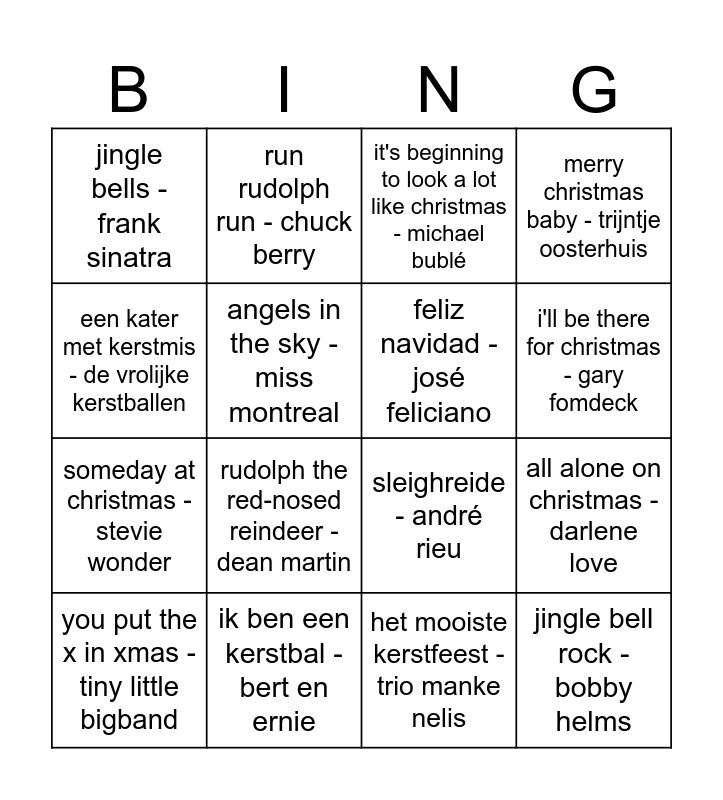 This bingo card has 60 words: Driving home for christmas - chris rea, All i want for christmas is you - mariah carey, thank god it's christmas - queen, jingle bell rock - bobby helms, rockin' around the christmas tree - brenda lee, let is snow, let it snow, let it snow - dean martin, feliz navidad - josé feliciano, santa claus is coming to town - frank sinatra, seal, someday at christmas - stevie wonder, Someday at christmas - trijntje oosterhuis, merry christmas baby - trijntje oosterhuis, christmas without you - ava max, angels in the sky - miss montreal, i want to come home for christmas - marvin gaye, what christmas means to me - joss stone, jingle bells - frank sinatra, you put the x in xmas - tiny little bigband, een kater met kerstmis - de vrolijke kerstballen, last christmas - wham!, i'll be there for christmas - gary fomdeck, ik ben een kerstbal - bert en ernie, it's beginning to look a lot like christmas - michael bublé, here comes santa claus - elvis presley, christmas lights - coldplay, happy xmas (war is over) john lennon, The first noël - andy williams, cold cold christmas - dana, sleig ride - the ronnetes, rudolph the red-nosed reindeer - dean martin, merry christmas everyone - shakin' stevens, We all stand together - paul mccartney, why couldn't it be christmas everyday? - bianca ryan, carol of the bells - john williams, do you hear what i hear - bing crosby, run rudolph run - chuck berry, santa baby - madonna, flappie - youp van 't hek, all alone on christmas - darlene love, ave maria - jantje smit, sleighreide - andré rieu, winter wonderland - rob de nijs, hoe leit dit kinderen - herman van veen, het mooiste kerstfeest - trio manke nelis, eenzame kerst - andre hazes, er is een kindeke geboren op aard - corry konings, sleigh ride - the ronettes, my only wish (this year - britney spears, one more sleep - leona lewis, one in a lifetime - gavin james, hallelujah - pentatonix, my favourite time of the year - pete masitti, home for the holidays - pentatonix, stop the cavalry - jona lewie, please santa - david kater, holiday - emma heesters, als de eerste sneeuw valt - emma heesters, snowman - sia, snow (hey oh) - red hot chili peppers, february stars - foo fighters and Winterlude - bob dylan.