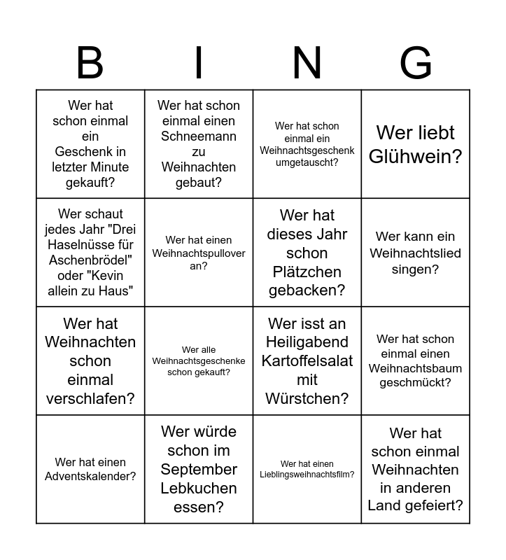 This bingo card has 16 words: Wer würde schon im September Lebkuchen essen?, Wer hat schon einmal einen Weihnachtsbaum geschmückt?, Wer hat schon einmal ein Weihnachtsgeschenk umgetauscht?, Wer hat schon einmal ein Geschenk in letzter Minute gekauft?, Wer hat Weihnachten schon einmal verschlafen?, Wer hat schon einmal einen Schneemann zu Weihnachten gebaut?, Wer isst an Heiligabend Kartoffelsalat mit Würstchen?, Wer hat einen Lieblingsweihnachtsfilm?, Wer schaut jedes Jahr "Drei Haselnüsse für Aschenbrödel" oder "Kevin allein zu Haus", Wer hat einen Weihnachtspullover an?, Wer hat einen Adventskalender?, Wer liebt Glühwein?, Wer alle Weihnachtsgeschenke schon gekauft?, Wer kann ein Weihnachtslied singen?, Wer hat dieses Jahr schon Plätzchen gebacken? and Wer hat schon einmal Weihnachten in anderen Land gefeiert?.