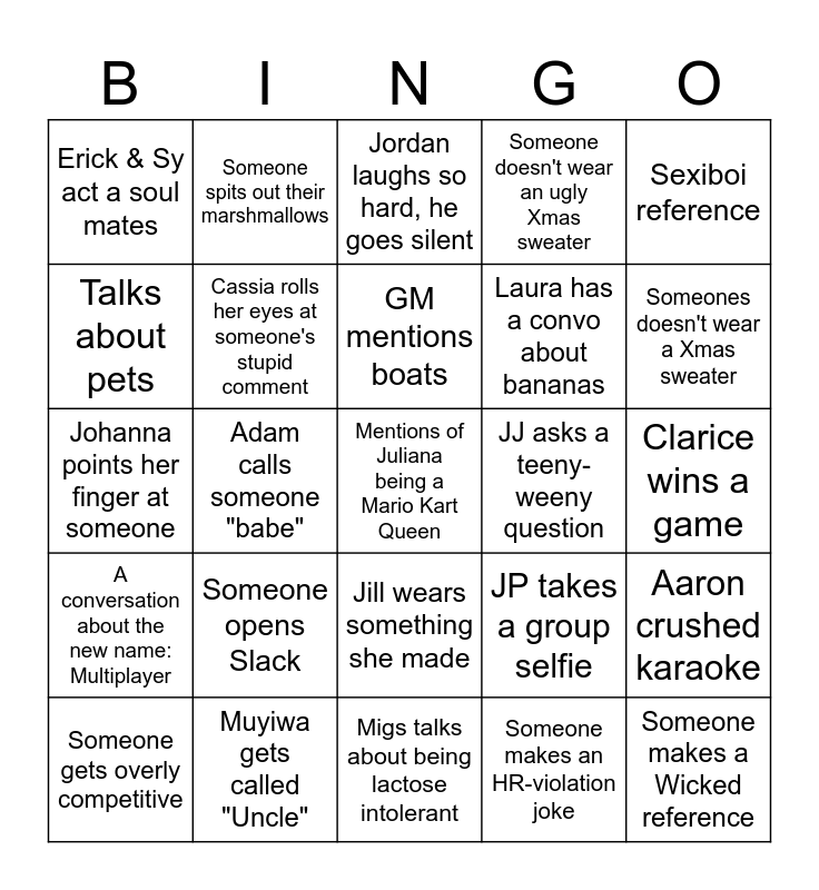 This bingo card has a free space and 24 words: Someone opens Slack, Muyiwa gets called "Uncle", GM mentions boats, Someone gets overly competitive, Sexiboi reference, Erick & Sy act a soul mates, Talks about pets, Someone spits out their marshmallows, JJ asks a teeny-weeny question, Jill wears something she made, Laura has a convo about bananas, Johanna points her finger at someone, JP takes a group selfie, Aaron crushed karaoke, Cassia rolls her eyes at someone's stupid comment, Someone makes an HR-violation joke, Clarice wins a game, Jordan laughs so hard, he goes silent, Someones doesn't wear a Xmas sweater, Adam calls someone "babe", Someone makes a Wicked reference, A conversation about the new name: Multiplayer, Someone doesn't wear an ugly Xmas sweater and Migs talks about being lactose intolerant.