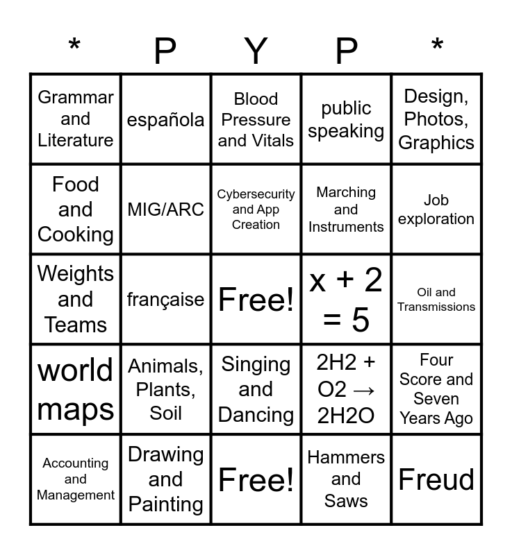 This bingo card has a free space and 24 words: Animals, Plants, Soil, Drawing and Painting, Cybersecurity and App Creation, Accounting and Management, Design, Photos, Graphics, Grammar and Literature, Food and Cooking, española, x + 2 = 5, Singing and Dancing, Marching and Instruments, Weights and Teams, 2H2 + O2 → 2H2O, Four Score and Seven Years Ago, MIG/ARC, Hammers and Saws, Oil and Transmissions, Blood Pressure and Vitals, Job exploration, française, Freud, world maps, public speaking and Free!.