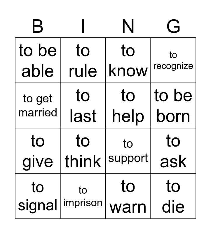 This bingo card has 18 words: to think, to die, to know, to be able, to support, to recognize, to signal, to rule, to be born, to give, to warn, to get married, to ask, to last, to help, to start, to imprison and to flee.