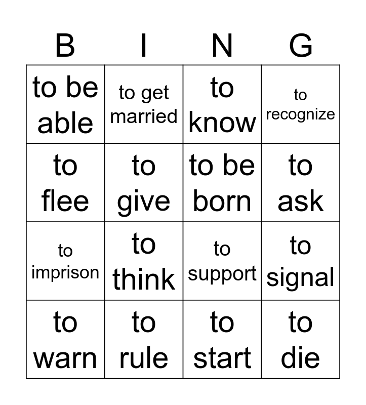 This bingo card has 18 words: to think, to die, to know, to be able, to support, to recognize, to warn, to get married, to ask, to imprison, to start, to flee, to signal, to give, to be born, to last, to rule and to help.