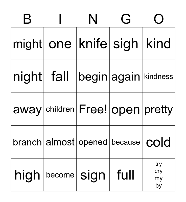 This bingo card has a free space and 24 words: almost, become, begin, high, kind, might, night, one, open, opened, again, away, because, cold, fall, full, pretty, knife, kindness, children, try cry my by, branch, sigh and sign.