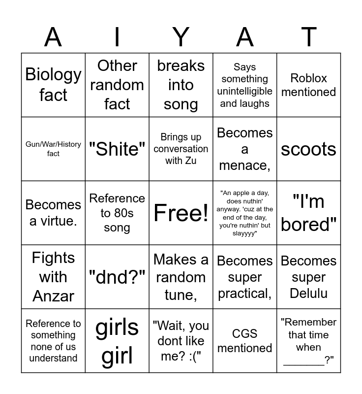 This bingo card has a free space and 25 words: "dnd?", "Wait, you dont like me? :(", Brings up conversation with Zu, Reference to something none of us understand, Roblox mentioned, Biology fact, Gun/War/History fact, Other random fact, "An apple a day, does nuthin' anyway. 'cuz at the end of the day, you're nuthin' but slayyyy", Makes a random tune,, Becomes a menace,, Becomes a virtue., Becomes super practical,, Becomes super Delulu, "Shite", Word from other language, "I'm bored", breaks into song, scoots, Reference to 80s song, "Remember that time when _______?", girls girl, Fights with Anzar, Says something unintelligible and laughs and CGS mentioned.
