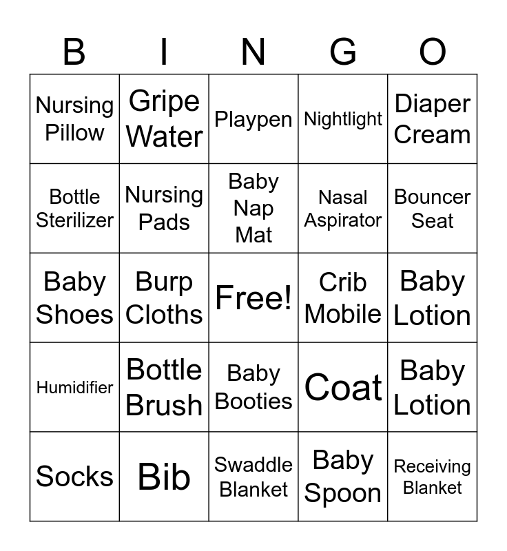 This bingo card has a free space and 86 words: Baby Bathtub, Baby Blanket, Baby Booties, Baby Bottle, Baby Bowl, Baby Brush, Baby Carrier, Baby First Aid Kit, Baby Food Jar, Baby Fork, Baby Gym, Baby Hat, Baby Lotion, Baby Lotion, Baby Monitor, Baby Nap Mat, Baby Oil, Baby Pillow, Baby Powder, Baby Rocker, Baby Romper, Baby Shampoo, Baby Shoes, Baby Soap, Baby Spoon, Baby Sweater, Baby Swing, Baby T-shirt, Baby Wipes, Bath Toys, Bib, Booties, Bottle, Bottle Brush, Bottle Sterilizer, Bottle Warmer, Bouncer Seat, Breast Pump, Bunting Bag, Burp Cloths, Car Mirror, Changing Pad, Crib Bumper, Crib Mobile, Crib Sheets, Diaper Cream, Diapers, Gripe Water, Hair Brush, Hat, High Chair, Hooded Bath Towel, Humidifier, Jeans, Medicine Dropper, Mittens, Nail Clippers, Nasal Aspirator, Nightlight, Nursing Pads, Nursing Pillow, Onesie, Pacifier Clip, Pajamas, Play Mat, Playpen, Rattle, Receiving Blanket, Sippy Cup, Sleep Positioner, Sleep Sack, Sleeper, Socks, Sound Machine, Stroller, Stuffed Animal, Swaddle Blanket, Swaddle Wrap, Sweater, Swing, Teething Ring, Thermometer, Toys, Washcloths, Coat and Flannel Shirt.