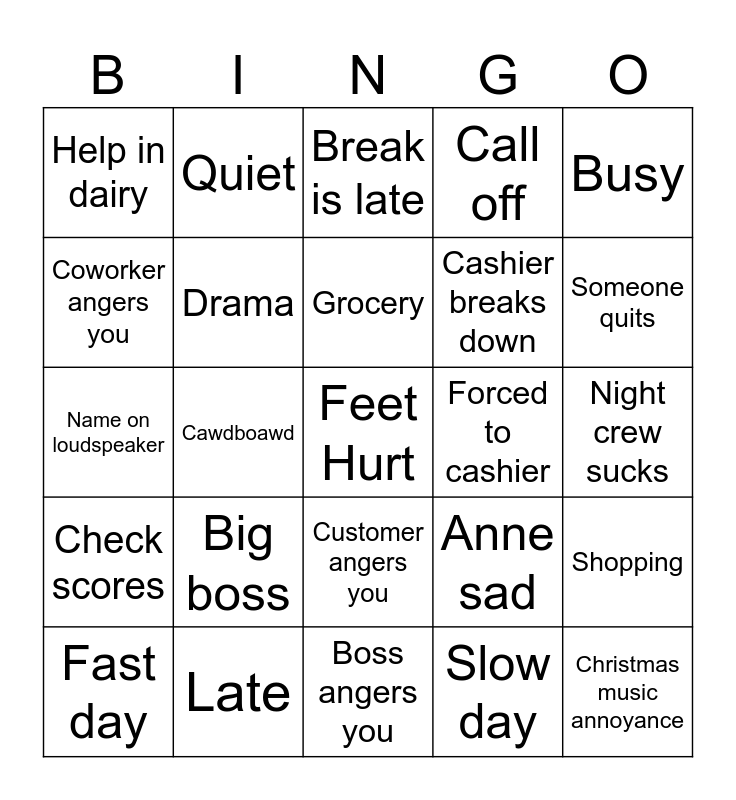 This bingo card has a free space and 24 words: Big boss, Late, Grocery, Fast day, Busy, Help in dairy, Coworker angers you, Quiet, Forced to cashier, Customer angers you, Cashier breaks down, Name on loudspeaker, Anne sad, Shopping, Drama, Slow day, Night crew sucks, Break is late, Someone quits, Cawdboawd, Christmas music annoyance, Check scores, Call off and Boss angers you.