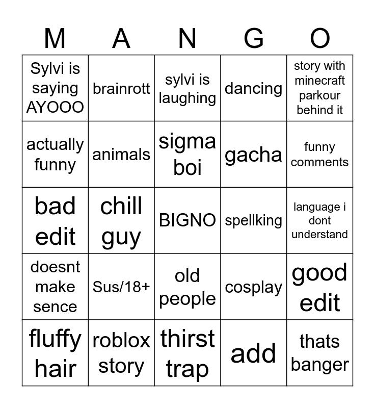 This bingo card has a free space and 24 words: Sus/18+, roblox story, sigma boi, fluffy hair, story with minecraft parkour behind it, Sylvi is saying AYOOO, actually funny, brainrott, spellking, old people, gacha, bad edit, cosplay, good edit, animals, add, language i dont understand, sylvi is laughing, funny comments, chill guy, thats banger, doesnt make sence, dancing and thirst trap.