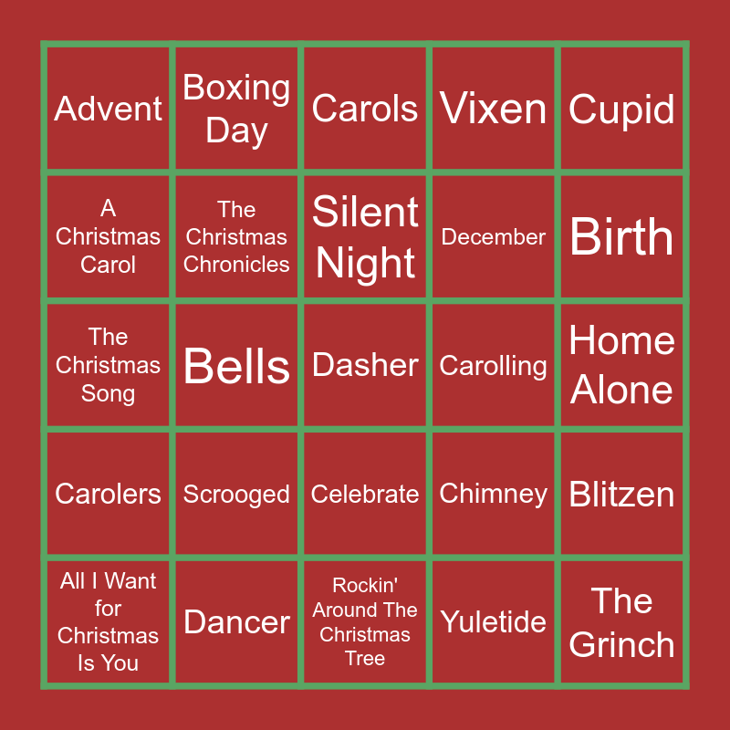 This bingo card has 1 images, a free space and 69 words: Home Alone, Christmas Tree, Rudolph, Dancer, Prancer, Vixen, Comet, Cupid, Donner, Blitzen, Candy Canes, Advent, Carols, Angel, Bells, Celebrate, December, Bauble, Carolers, Carolling, Chimney, Birth, Candy, Cheer, Chestnuts, Festive, Santa, Yuletide, Aglitter, Boxing Day, Saint Nicholas, Elf, It's a Wonderful Life, The Muppet Christmas Carol, Miracle on 34th Street, The Santa Clause, The Polar Express, Bad Santa, A Christmas Carol, Love Actually, Scrooged, The Grinch, The Holiday, Jingle All the Way, The Christmas Chronicles, All I Want for Christmas Is You, Jingle Bell Rock, Last Christmas, White Christmas, Have Yourself a Merry Little Christmas, Jingle Bells, Santa Claus Is Coming to Town, Holly Jolly Christmas, Rockin' Around The Christmas Tree, Rudolph the Red-Nosed Reindeer, Silent Night, Christmas (Baby Please Come Home), Sleigh Ride, Fairytale of New York, The Christmas Song, Santa Baby, The Twelve Days of Christmas, Deck the Halls, Feliz Navidad, Joy to the World, Let It Snow! Let It Snow! Let It Snow!, Driving Home for Christmas, I Wish It Could Be Christmas Everyday and We Wish You a Merry Chris.