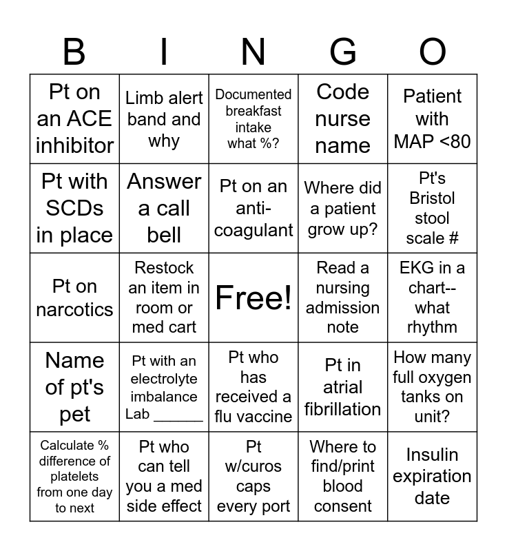 This bingo card has a free space and 24 words: Pt with an electrolyte imbalance Lab ______, Pt who can tell you a med side effect, Pt on an anti-coagulant, Calculate % difference of platelets from one day to next, Patient with MAP <80, Pt on an ACE inhibitor, Pt with SCDs in place, Limb alert band and why, Read a nursing admission note, Pt who has received a flu vaccine, Where did a patient grow up?, Pt on narcotics, Pt in atrial fibrillation, How many full oxygen tanks on unit?, Answer a call bell, Where to find/print blood consent, EKG in a chart--what rhythm, Documented breakfast intake what %?, Pt's Bristol stool scale #, Restock an item in room or med cart, Insulin expiration date, Name of pt's pet, Code nurse name and Pt w/curos caps every port.