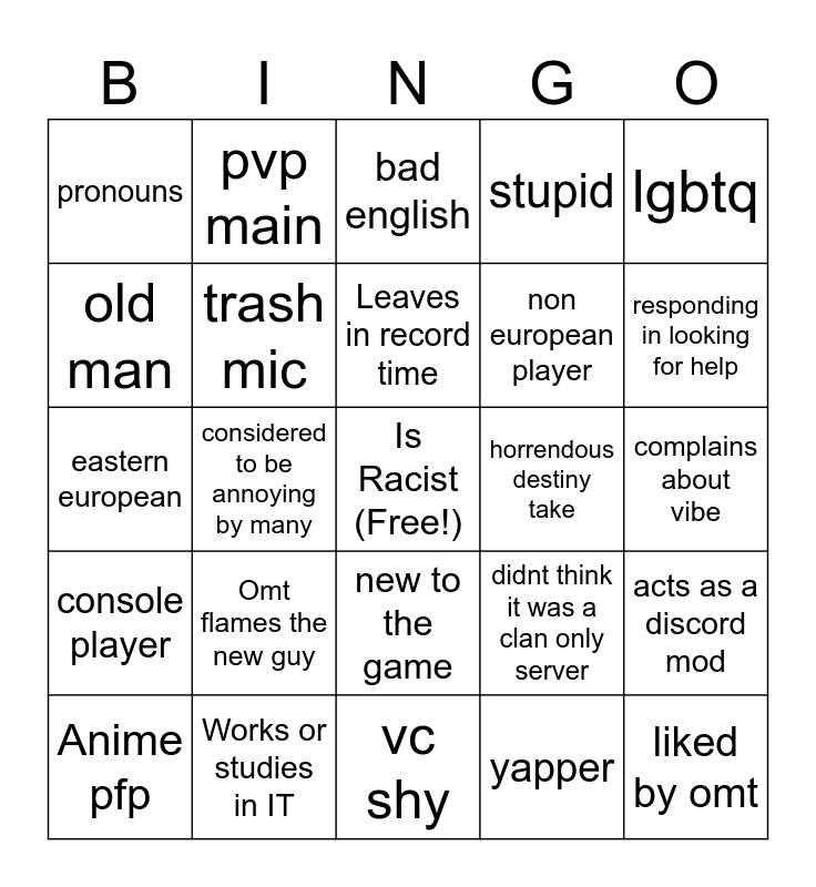 This bingo card has a free space and 24 words: Omt flames the new guy, Works or studies in IT, Leaves in record time, Anime pfp, lgbtq, pronouns, old man, pvp main, horrendous destiny take, new to the game, non european player, eastern european, didnt think it was a clan only server, acts as a discord mod, trash mic, yapper, complains about vibe, bad english, responding in looking for help, considered to be annoying by many, liked by omt, console player, stupid and vc shy.
