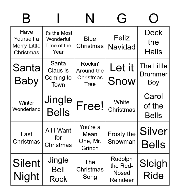 This bingo card has a free space and 24 words: All I Want for Christmas, Jingle Bell Rock, Rockin' Around the Christmas Tree, Silent Night, Deck the Halls, Have Yourself a Merry Little Christmas, Santa Baby, It's the Most Wonderful Time of the Year, White Christmas, You're a Mean One, Mr. Grinch, Let it Snow, Winter Wonderland, Frosty the Snowman, Silver Bells, Santa Claus is Coming to Town, Rudolph the Red-Nosed Reindeer, Carol of the Bells, Blue Christmas, The Little Drummer Boy, Jingle Bells, Sleigh Ride, Last Christmas, Feliz Navidad and The Christmas Song.