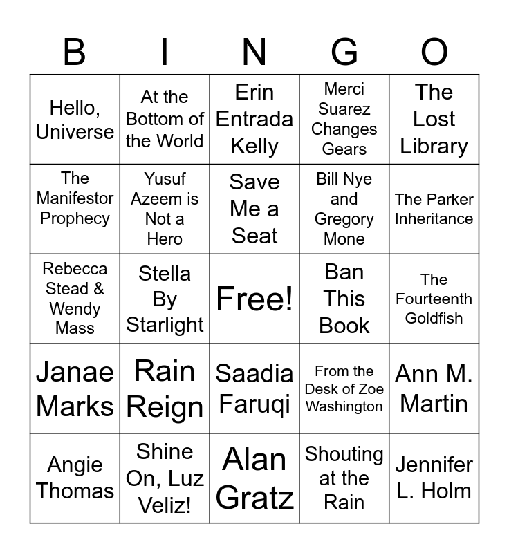 This bingo card has a free space and 30 words: Shine On, Luz Veliz!, Rebecca Balcarcel, Stella By Starlight, Sharon M Draper, Hello, Universe, Erin Entrada Kelly, Yusuf Azeem is Not a Hero, Saadia Faruqi, Ban This Book, Alan Gratz, The Fourteenth Goldfish, Jennifer L. Holm, Shouting at the Rain, Lynda Mullaly Hunt, The Parker Inheritance, Chester Keene Cracks the Code, From the Desk of Zoe Washington, Janae Marks, Rain Reign, The Lost Library, Rebecca Stead & Wendy Mass, Meg Medina, At the Bottom of the World, Bill Nye and Gregory Mone, The Manifestor Prophecy, Merci Suarez Changes Gears, Ann M. Martin, Angie Thomas, Save Me a Seat and Sarah Weeks and Gita Varadarajan.