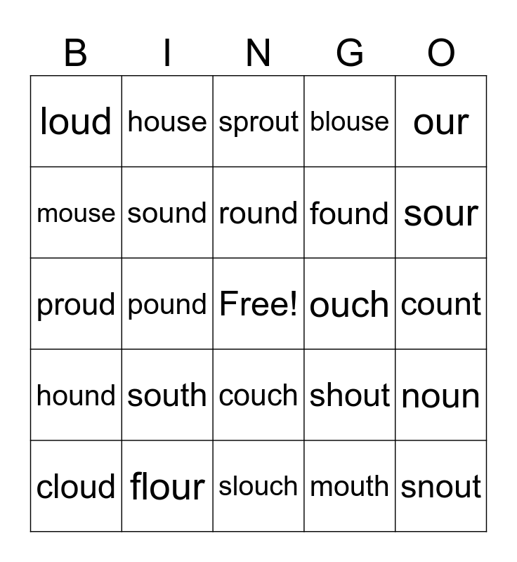 This bingo card has a free space and 24 words: south, flour, round, cloud, our, loud, mouse, house, ouch, couch, found, proud, shout, noun, sound, mouth, count, sprout, sour, pound, snout, hound, blouse and slouch.