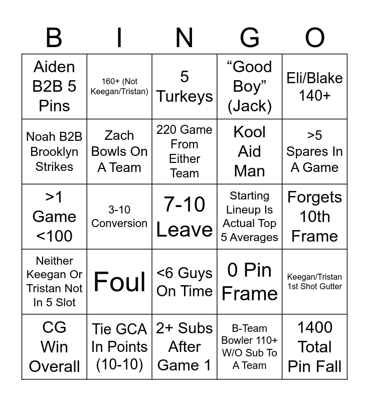 This bingo card has 25 words: Foul, 2+ Subs After Game 1, 220 Game From Either Team, CG Win Overall, Eli/Blake 140+, Aiden B2B 5 Pins, Noah B2B Brooklyn Strikes, 160+ (Not Keegan/Tristan), Starting Lineup Is Actual Top 5 Averages, <6 Guys On Time, Kool Aid Man, >1 Game <100, 0 Pin Frame, Keegan/Tristan 1st Shot Gutter, Zach Bowls On A Team, 1400 Total Pin Fall, Forgets 10th Frame, 5 Turkeys, >5 Spares In A Game, 3-10 Conversion, 7-10 Leave, Tie GCA In Points (10-10), Neither Keegan Or Tristan Not In 5 Slot, “Good Boy” (Jack) and B-Team Bowler 110+ W/O Sub To A Team.