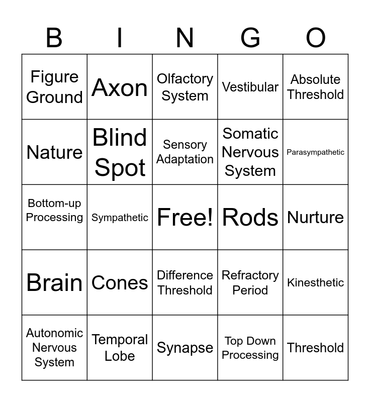 This bingo card has a free space and 24 words: Cones, Temporal Lobe, Sensory Adaptation, Autonomic Nervous System, Absolute Threshold, Figure Ground, Nature, Axon, Rods, Difference Threshold, Somatic Nervous System, Bottom-up Processing, Refractory Period, Kinesthetic, Blind Spot, Top Down Processing, Nurture, Olfactory System, Parasympathetic, Sympathetic, Threshold, Brain, Vestibular and Synapse.
