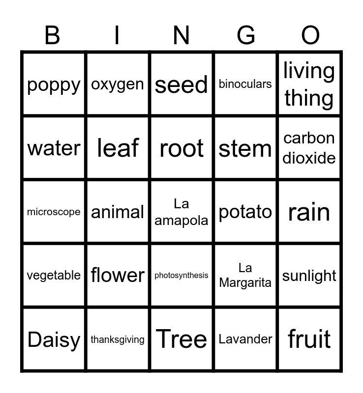 This bingo card has 25 words: flower, Tree, root, Daisy, living thing, poppy, water, oxygen, potato, photosynthesis, stem, microscope, La Margarita, sunlight, leaf, fruit, rain, seed, carbon dioxide, animal, La amapola, thanksgiving, vegetable, binoculars and Lavander.