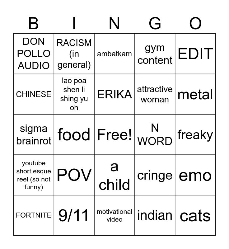 This bingo card has a free space and 24 words: POV, 9/11, ERIKA, FORTNITE, EDIT, DON POLLO AUDIO, CHINESE, RACISM (in general), N WORD, a child, attractive woman, sigma brainrot, cringe, emo, lao poa shen li shing yu oh, indian, freaky, ambatkam, metal, food, cats, youtube short esque reel (so not funny), gym content and motivational video.