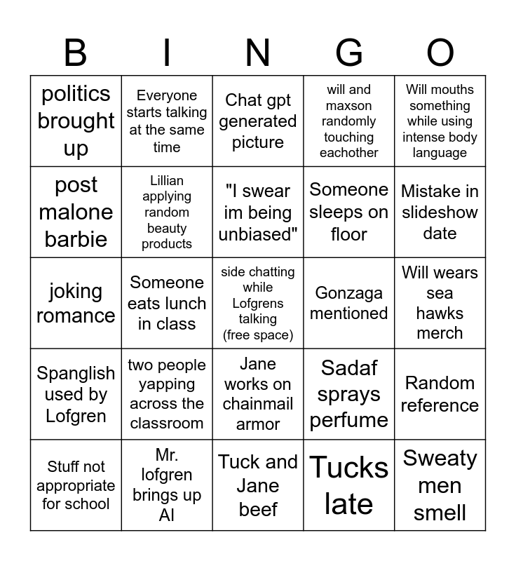 This bingo card has a free space and 31 words: Tuck and Jane beef, Mr. Lofgren wears flannel, Someone eats lunch in class, Tuck is clueless, politics brought up, Chat gpt generated picture, Lillian applying random beauty products, Sadaf sprays perfume, Gonzaga mentioned, Tucks late, Will wears sea hawks merch, Sweaty men smell, conch horn used, "person is raising their hand nicely", Mistake in slideshow date, Mr. Lofgren does a voice for a character, Random reference, two people yapping across the classroom, Spanglish used by Lofgren, Jane works on chainmail armor, Will mouths something while using intense body language, Communist soup brought up, Stuff not appropriate for school, Everyone starts talking at the same time, Someone sleeps on floor, post malone barbie, will and maxson randomly touching eachother, joking romance, Mr. lofgren brings up AI, "I swear im being unbiased" and "freakenstein".