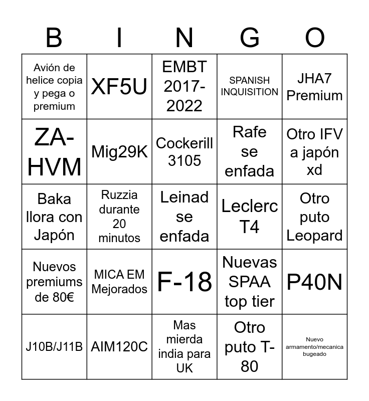 This bingo card has a free space and 24 words: MICA EM Mejorados, AIM120C, Cockerill 3105, J10B/J11B, JHA7 Premium, Avión de helice copia y pega o premium, ZA-HVM, XF5U, Leclerc T4, F-18, Rafe se enfada, Baka llora con Japón, Nuevas SPAA top tier, P40N, Mig29K, Otro puto T-80, Otro puto Leopard, EMBT 2017-2022, Otro IFV a japón xd, Ruzzia durante 20 minutos, Nuevo armamento/mecanica bugeado, Nuevos premiums de 80€, SPANISH INQUISITION and Mas mierda india para UK.