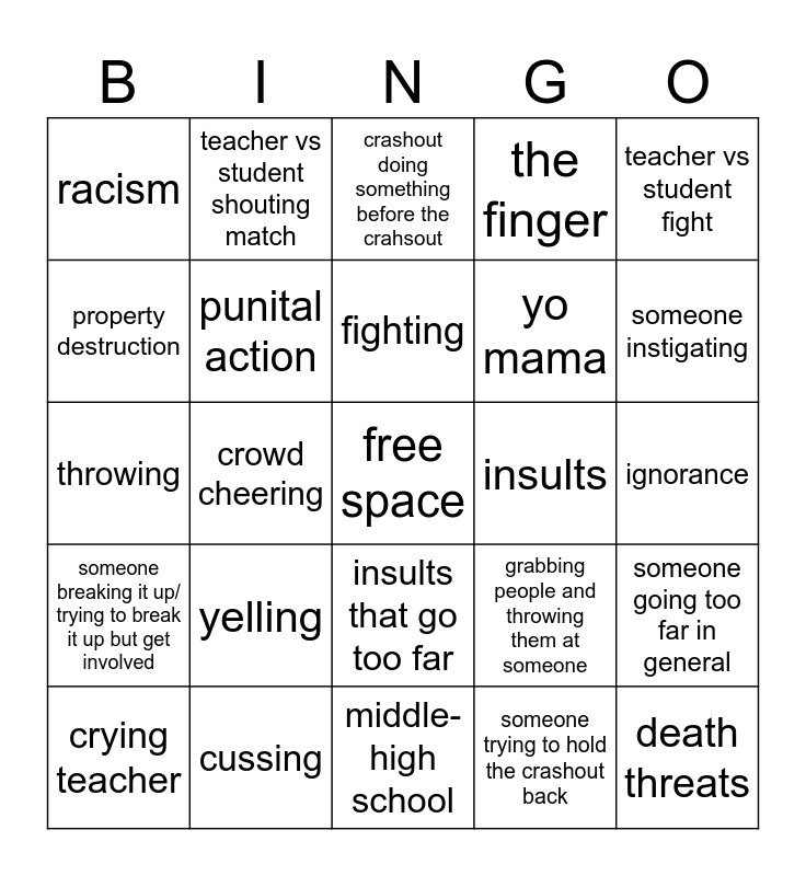 This bingo card has a free space and 24 words: yelling, cussing, fighting, crying teacher, teacher vs student fight, racism, property destruction, teacher vs student shouting match, insults, insults that go too far, yo mama, throwing, grabbing people and throwing them at someone, someone going too far in general, punital action, someone trying to hold the crashout back, ignorance, crashout doing something before the crahsout, someone instigating, crowd cheering, death threats, someone breaking it up/ trying to break it up but get involved, the finger and middle-high school.