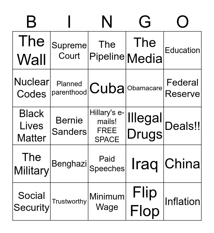 This bingo card has a free space and 24 words: Benghazi, Trustworthy, Cuba, Social Security, Education, The Wall, Nuclear Codes, Supreme Court, Illegal Drugs, Paid Speeches, Obamacare, Black Lives Matter, Iraq, China, Planned parenthood, Flip Flop, Deals!!, The Pipeline, Federal Reserve, Bernie Sanders, Inflation, The Military, The Media and Minimum Wage.