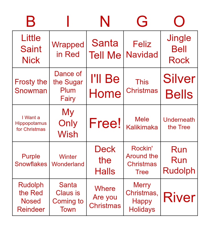 This bingo card has a free space and 35 words: 12 Days of Christmas, All I want for Christmas is You, Baby, It's Cold Outside, Dance of the Sugar Plum Fairy, Deck the Halls, Feliz Navidad, Frosty the Snowman, Holly Jolly Christmas, I'll Be Home, It's Beginning to Look a Lot Like Christmas, I Want a Hippopotamus for Christmas, Jingle Bell Rock, Last Christmas, Little Jack Frost Get Lost, Little Saint Nick, Mele Kalikimaka, Merry Christmas, Happy Holidays, My Only Wish, Purple Snowflakes, River, Rockin' Around the Christmas Tree, Rudolph the Red Nosed Reindeer, Run Run Rudolph, Santa Claus is Coming to Town, Santa Tell Me, Silver Bells, Sleigh Ride, Text Me Merry Christmas, This Christmas, Underneath the Tree, What are you doing New Year's Eve, Where Are you Christmas, Winter Wonderland, Wrapped in Red and You're a Mean One, Mr. Grinch.