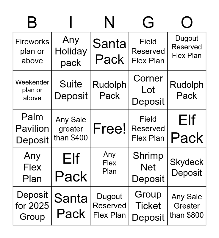 This bingo card has a free space and 24 words: Elf Pack, Santa Pack, Rudolph Pack, Deposit for 2025 Group, Dugout Reserved Flex Plan, Fireworks plan or above, Weekender plan or above, Any Holiday pack, Field Reserved Flex Plan, Any Flex Plan, Corner Lot Deposit, Palm Pavilion Deposit, Shrimp Net Deposit, Skydeck Deposit, Suite Deposit, Group Ticket Deposit, Elf Pack, Santa Pack, Rudolph Pack, Any Sale greater than $400, Any Sale Greater than $800, Any Flex Plan, Field Reserved Flex Plan and Dugout Reserved Flex Plan.