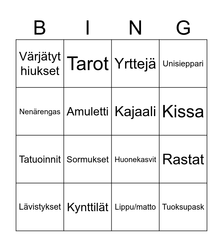 This bingo card has 21 words: Kynttilät, Kristallit, Tarot, Bisexuaali, Lippu/matto, Kajaali, Värjätyt hiukset, Yrttejä, Huonekasvit, Kissa, Tatuoinnit, Unisieppari, Tuoksupask, Horoskooppi, Amuletti, Spiritualismi, Lävistykset, Sormukset, Nenärengas, Rastat and Emofitti/Fishnets.