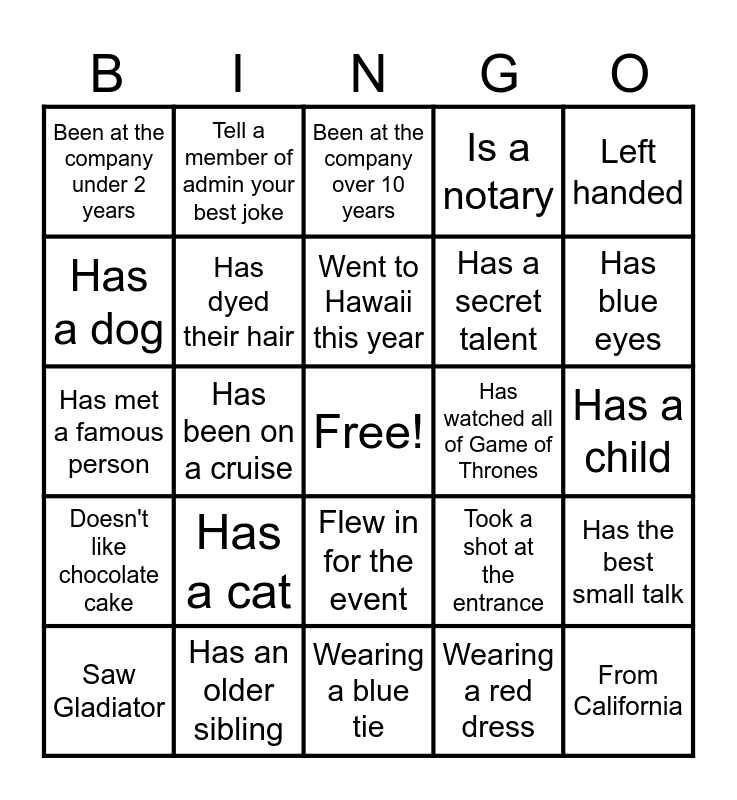 This bingo card has a free space and 24 words: Saw Gladiator, Has a cat, Went to Hawaii this year, Wearing a red dress, Left handed, Been at the company under 2 years, Tell a member of admin your best joke, Been at the company over 10 years, Has watched all of Game of Thrones, Has a child, Has met a famous person, Has dyed their hair, Took a shot at the entrance, Has the best small talk, Has a dog, Has an older sibling, Wearing a blue tie, Is a notary, Has blue eyes, Doesn't like chocolate cake, Has been on a cruise, Flew in for the event, Has a secret talent and From California.