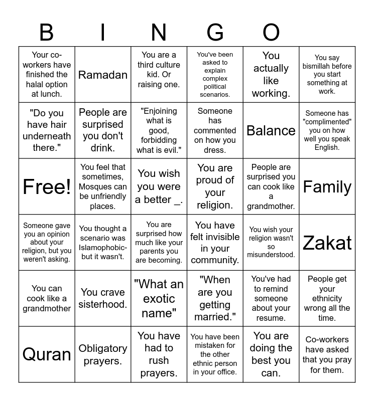 This bingo card has 36 words: "When are you getting married.", "What an exotic name", You have been mistaken for the other ethnic person in your office., "Do you have hair underneath there.", Someone gave you an opinion about your religion, but you weren't asking., You are proud of your religion., People are surprised you don't drink., You have had to rush prayers., You actually like working., You've had to remind someone about your resume., Someone has "complimented" you on how well you speak English., You've been asked to explain complex political scenarios., People get your ethnicity wrong all the time., You feel that sometimes, Mosques can be unfriendly places., Someone has commented on how you dress., Your co-workers have finished the halal option at lunch., You can cook like a grandmother, People are surprised you can cook like a grandmother., Free!, You are a third culture kid. Or raising one., You wish you were a better _., You thought a scenario was Islamophobic-but it wasn't., You have felt invisible in your community., You are surprised how much like your parents you are becoming., You wish your religion wasn't so misunderstood., Ramadan, Balance, Obligatory prayers., "Enjoining what is good, forbidding what is evil.", You say bismillah before you start something at work., Co-workers have asked that you pray for them., Quran, Zakat, Family, You crave sisterhood. and You are doing the best you can..
