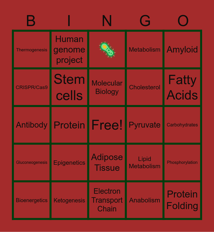 This bingo card has a free space and 75 words: 🎓, 🧬, 🦠, 💊, 🔬, RNA, Vaccine, coop, Biochemistry, Synthetic Biology, Fermentation, Microbiome, Molecular Biology, CRISPR/Cas9, Mitochondria, Protein, Chaperone, Protein Folding, Aggregation, Amyloid, Prion, Antibody, Stem cells, Human genome project, Metabolism, Enzymes, Cellular Respiration, Glycolysis, Krebs Cycle, Oxidative Phosphorylation, Mitochondria, ATP (Adenosine Triphosphate), Glucose, Lipid Metabolism, Fatty Acids, Cholesterol, Proteins, Amino Acids, Carbohydrates, Anabolism, Catabolism, Insulin, Glucagon, Endocrine System, Hormones, Signal Transduction, Bioenergetics, Thermogenesis, Nutrient Absorption, Microbiome, Homeostasis, Adipose Tissue, Brown Fat, White Fat, Leptin, Cortisol, Oxidative Stress, Reactive Oxygen Species (ROS), Antioxidants, Gene Expression, Epigenetics, Proteomics, Lipidomics, Metabolomics, Metabolic Pathways, Pyruvate, Acetyl-CoA, NADH (Nicotinamide Adenine Dinucleotide), FADH2 (Flavin Adenine Dinucleotide), Phosphorylation, Gluconeogenesis, Ketogenesis, Cytoplasm, Electron Transport Chain and Toxicology.