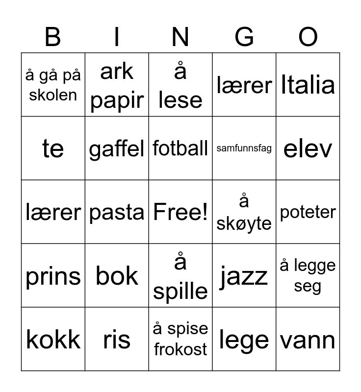 This bingo card has a free space and 102 words: Tyskland, Frankrike, Italia, Spania, Polen, Sverige, Danmark, Island, Finland, USA, Canada, Australia, Japan, Kina, konge, dronning, prins, prinsesse, kongefamilie, Østlandet, Vestlandet, Nordland, Trøndelag, Finnmark, skole, elev, lærer, bok, blyant, penn, ark papir, å lese, å skrive, å synge, å danse, å spille, å tegne, å stelle i hagen, lærer, lege, sykepleier, administrativ assistent, kokk, norsk, engelsk, matematikk, naturfag, samfunnsfag, brød, pålegg, syltetøy, kaffe, te, jus, smørbrød, suppe, pizza, lapskaus, salat, vann, melk, saft, brus, øl, kjøtt, fisk, grønnsaker, poteter, pasta, ris, kake, is, sjokolade, frukt, vafler, tallerken, gaffel, kniv, skje, glass, å gå på tur, å sykle, å stå på ski, å skøyte, å dra på båttur, fotball, håndball, ishockey, langrenn, pop, rock, jazz, klassisk, hip-hop, å stå opp, å spise frokost, å gå på skolen, å sminke seg, å legge seg, å barbere seg, å vaske seg and å skynde seg.