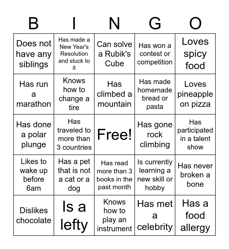 This bingo card has a free space and 29 words: Dislikes chocolate, Prefers winter over summer, Has traveled to more than 3 countries, Is a big fan of karaoke, Does not have any siblings, Can solve a Rubik's Cube, Knows how to change a tire, Has a pet that is not a cat or a dog, Has gone rock climbing, Is a lefty, Has participated in a talent show, Has a food allergy, Knows how to play an instrument, Has met a celebrity, Loves pineapple on pizza, Is always early to events, Has read more than 3 books in the past month, Likes to wake up before 6am, Loves spicy food, Has done a polar plunge, Is currently learning a new skill or hobby, Can recite the alphabet backwards, Has made homemade bread or pasta, Has run a marathon, Has won a contest or competition, Has made a New Year's Resolution and stuck to it, Has never broken a bone, Has climbed a mountain and Has slept under the stars (no tent!).