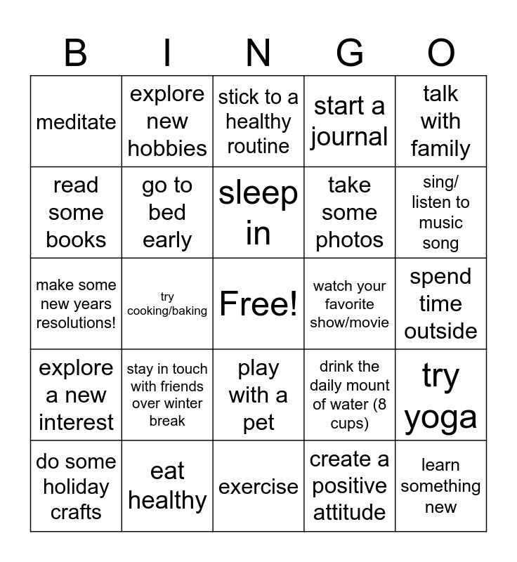 This bingo card has a free space and 24 words: stay in touch with friends over winter break, eat healthy, sleep in, do some holiday crafts, talk with family, meditate, read some books, explore new hobbies, watch your favorite show/movie, play with a pet, take some photos, make some new years resolutions!, drink the daily mount of water (8 cups), try yoga, go to bed early, create a positive attitude, spend time outside, stick to a healthy routine, sing/ listen to music song, try cooking/baking, learn something new, explore a new interest, start a journal and exercise.