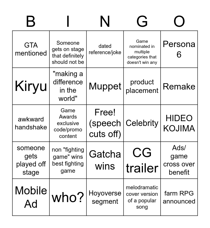This bingo card has a free space and 24 words: non "fighting game" wins best fighting game, who?, Muppet, Mobile Ad, Persona 6, GTA mentioned, Kiryu, Someone gets on stage that definitely should not be, Celebrity, Gatcha wins, product placement, awkward handshake, CG trailer, Ads/ game cross over benefit, "making a difference in the world", melodramatic cover version of a popular song, HIDEO KOJIMA, dated reference/joke, Remake, Game Awards exclusive code/promo content, farm RPG announced, someone gets played off stage, Game nominated in multiple categories that doesn't win any and Hoyoverse segment.