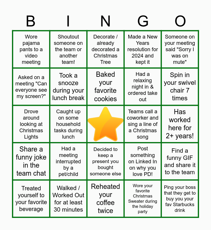 This bingo card has a free space and 24 words: Had a meeting interrupted by a pet/child, Walked / Worked Out for at least 30 minutes, Baked your favorite cookies, Treated yourself to your favorite beverage, Someone on your meeting said "Sorry I was on mute", Wore pajama pants to a video meeting, Asked on a meeting "Can everyone see my screen?", Shoutout someone on the team or another team!, Teams call a coworker and sing a line of a Christmas song, Decided to keep a present you bought someone else, Had a relaxing night in & ordered take out, Drove around looking at Christmas Lights, Post something on Linked In on why you love PD!, Find a funny GIF and share it to the team, Took a snooze during your lunch break, Wore your favorite Christmas Sweater during the holiday party, Has worked here for 2+ years!, Decorate / already decorated a Christmas Tree, Spin in your swivel chair 7 times, Caught up on some household tasks during lunch, Ping your boss that they get to buy you your fav Starbucks drink, Share a funny joke in the team chat, Made a New Years resolution for 2024 and kept it and Reheated your coffee twice.