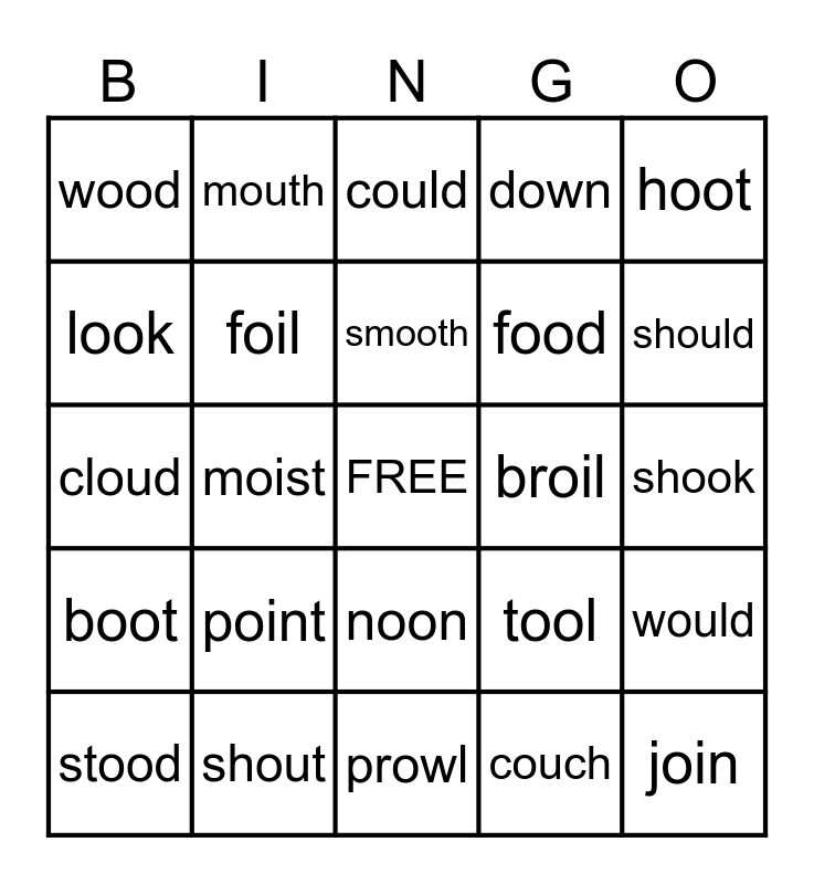 This bingo card has a free space and 24 words: point, shout, smooth, stood, hoot, wood, look, mouth, broil, noon, food, cloud, tool, would, foil, couch, shook, could, should, moist, join, boot, down and prowl.