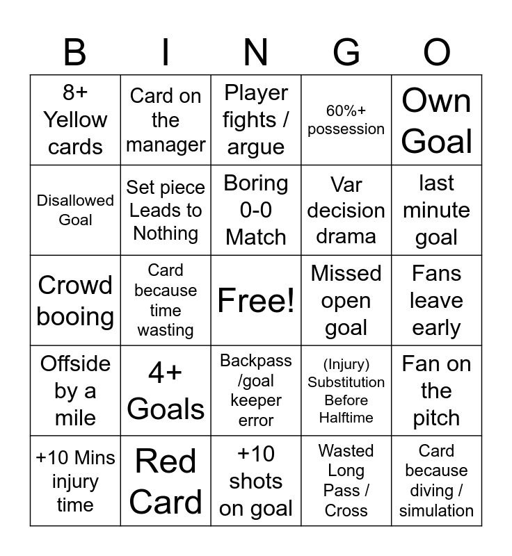 This bingo card has a free space and 24 words: 4+ Goals, Red Card, Boring 0-0 Match, +10 Mins injury time, Own Goal, 8+ Yellow cards, Disallowed Goal, Card on the manager, Missed open goal, Backpass /goal keeper error, Var decision drama, Crowd booing, (Injury) Substitution Before Halftime, Fan on the pitch, Set piece Leads to Nothing, Wasted Long Pass / Cross, Fans leave early, Player fights / argue, last minute goal, Card because time wasting, Card because diving / simulation, Offside by a mile, 60%+ possession and +10 shots on goal.