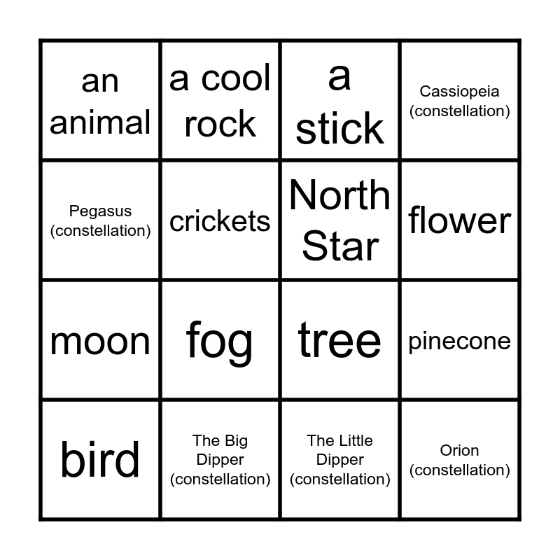 This bingo card has 16 words: The Big Dipper (constellation), pinecone, a stick, an animal, moon, a cool rock, tree, The Little Dipper (constellation), Pegasus (constellation), crickets, bird, Cassiopeia (constellation), fog, flower, North Star and Orion (constellation).