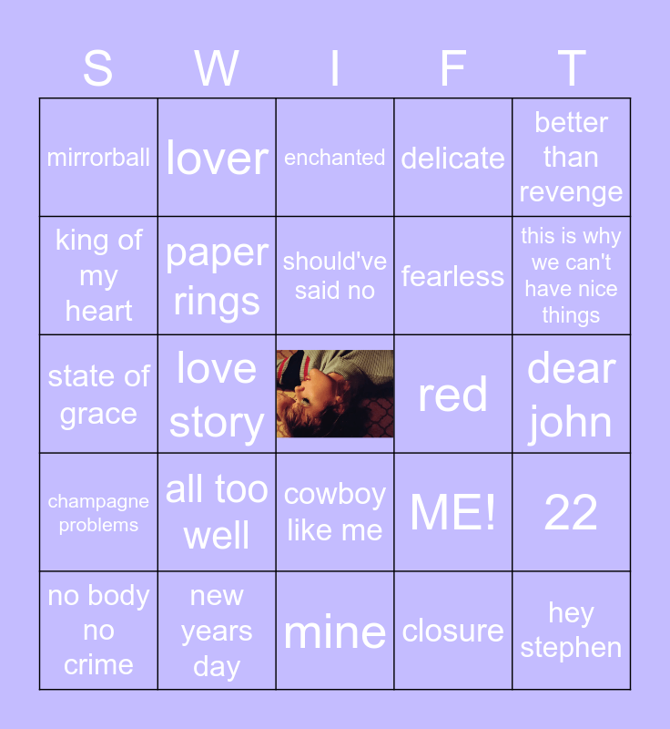 This bingo card has a free space and 24 words: all too well, new years day, should've said no, no body no crime, better than revenge, mirrorball, king of my heart, lover, red, cowboy like me, fearless, state of grace, ME!, 22, paper rings, closure, dear john, enchanted, this is why we can't have nice things, love story, hey stephen, champagne problems, delicate and mine.