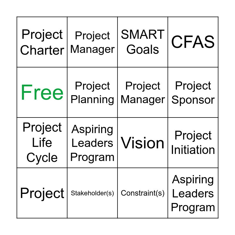 This bingo card has 16 words: Stakeholder(s), Project Initiation, SMART Goals, Project Charter, Project Life Cycle, Project Manager, Vision, Constraint(s), Free, Project Planning, Project, CFAS, Aspiring Leaders Program, Project Sponsor, Project Manager and Aspiring Leaders Program.