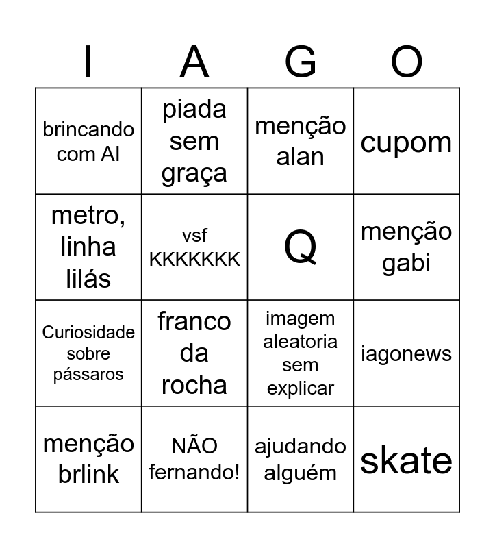 This bingo card has 16 words: menção brlink, NÃO fernando!, menção alan, cupom, metro, linha lilás, piada sem graça, imagem aleatoria sem explicar, iagonews, brincando com AI, vsf KKKKKKK, ajudando alguém, menção gabi, Curiosidade sobre pássaros, franco da rocha, Q and skate.