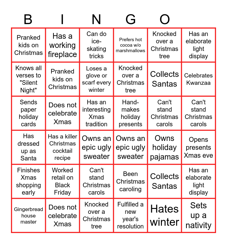 ⚠ This card has duplicate items: Hand-makes holiday presents (3), Can do ice-skating tricks (2), Did a kind deed for a stranger (3), Has an interesting Xmas tradition (2), Does not celebrate Xmas (2), Hates peppermint (2), Owns an epic ugly sweater (2), Can't stand Christmas carols (3), Volunteers at Christmas time (2), Pranked kids on Christmas (2), Has an elaborate light display (2), Worked retail on Black Friday (2), Celebrates Kwanzaa (2), Finishes Xmas shopping early (3), Knocked over a Christmas tree (3), Collects Santas (2), Prefers hot cocoa w/o marshmallows (2), Been Christmas caroling (2), Has a killer Christmas cocktail recipe (2), Loves peppermint (2), Witnessed a real-life holiday proposal (2), Watches same Xmas movie yearly (2), Pet a reindeer (2), watched 20+ low budget Xmas movies (2), Sets up a nativity (2), Loses a glove or scarf every winter (2), Hates winter (2)