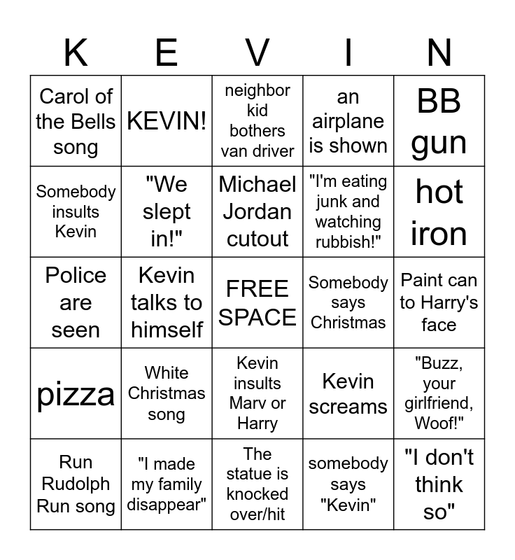 This bingo card has a free space and 24 words: White Christmas song, "I made my family disappear", Michael Jordan cutout, Run Rudolph Run song, BB gun, Carol of the Bells song, Somebody insults Kevin, KEVIN!, Somebody says Christmas, Kevin insults Marv or Harry, "I'm eating junk and watching rubbish!", Police are seen, Kevin screams, "Buzz, your girlfriend, Woof!", "We slept in!", somebody says "Kevin", Paint can to Harry's face, neighbor kid bothers van driver, hot iron, Kevin talks to himself, "I don't think so", pizza, an airplane is shown and The statue is knocked over/hit.