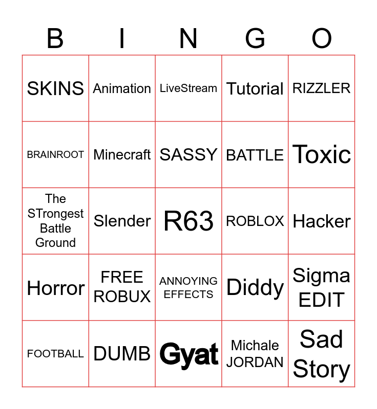 This bingo card has a free space and 24 words: FREE ROBUX, DUMB, SASSY, FOOTBALL, RIZZLER, SKINS, BRAINROOT, Animation, ROBLOX, ANNOYING EFFECTS, BATTLE, The STrongest Battle Ground, Diddy, Sigma EDIT, Minecraft, Michale JORDAN, Hacker, LiveStream, Toxic, Slender, Sad Story, Horror, Tutorial and Gyat.